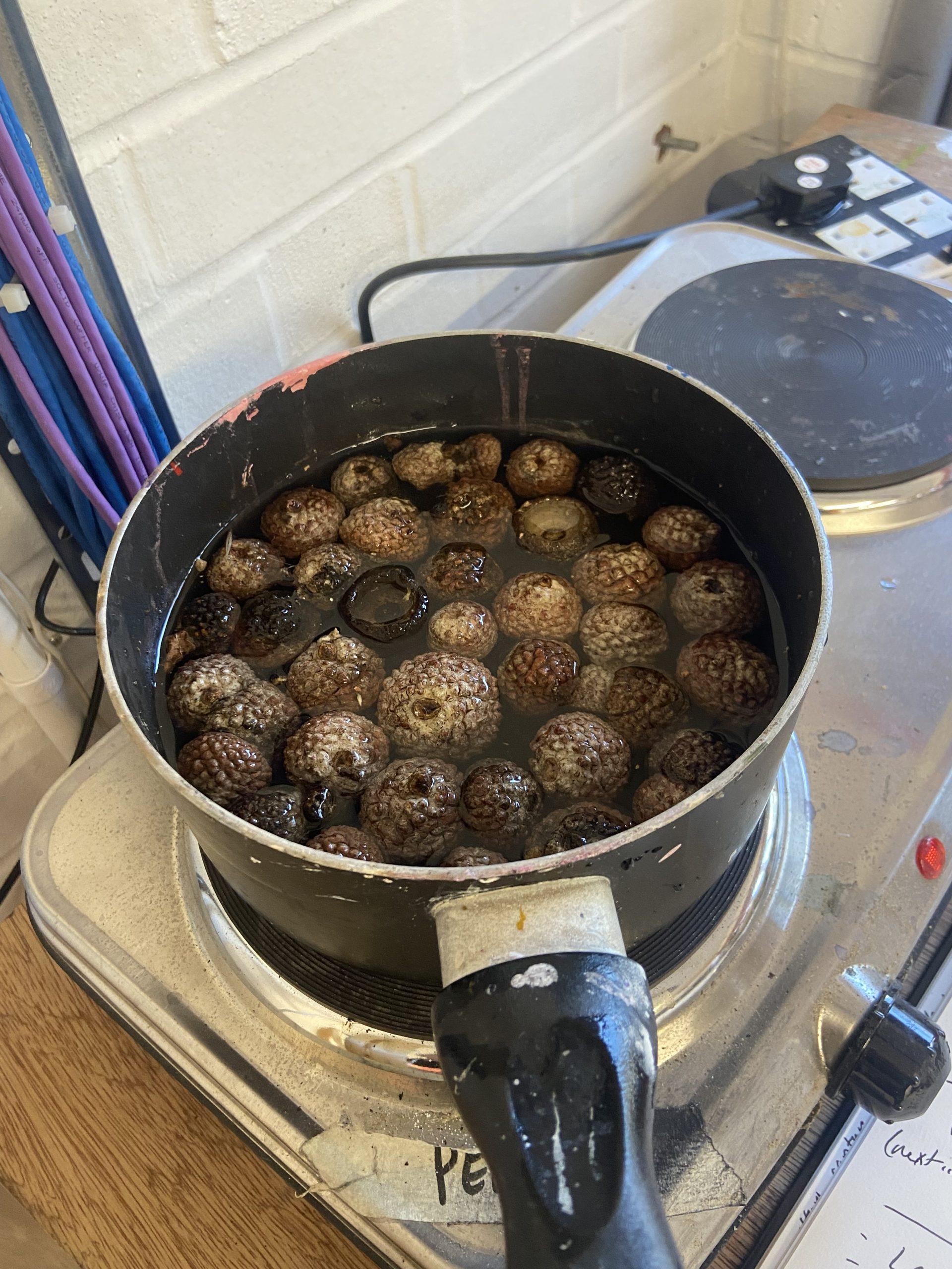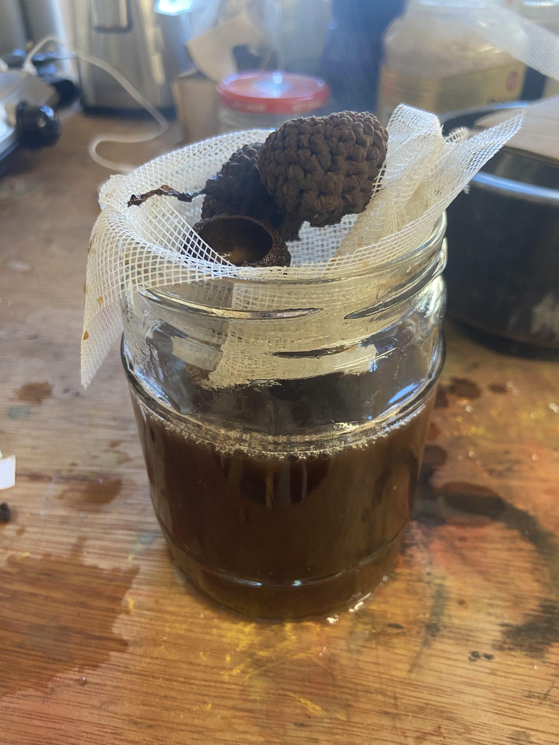I began by following the recipe in Make Ink: A Forager’s Guide to Ink Making, but it wasn’t long before I took a detour. This was the first recipe I was drawn to upon reading this book, and it called for rusty nails. I patiently waited a couple weeks for some nails to rust, then popped them in the pan with acorn husks and some of the rusty water, but the ink did not turn black. I think this was due to a combination of not enough rustyness and maybe not a long enough simmer. So, I added some iron sulphate and wham-o, to the rescue. I mixed some of this black inkyness with casein and painted with it.