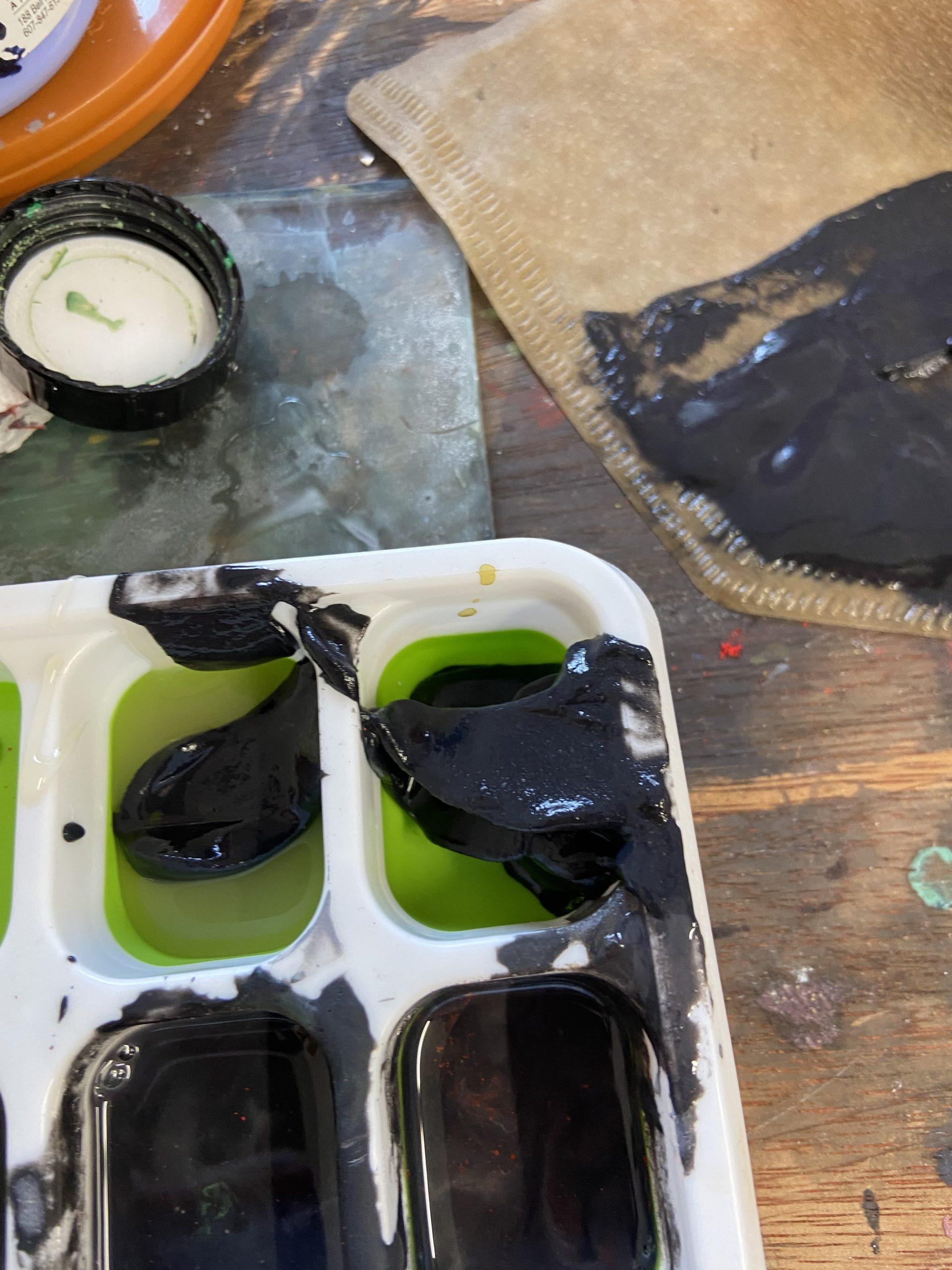 …But is it pigment? Is it pigment if I say its pigment? It is a satisfyingly sludgy dark matter that spreads by brush. It dries grey on its own- like watching embers turn to ash, or paints a rich black when mixed with gum arabic.