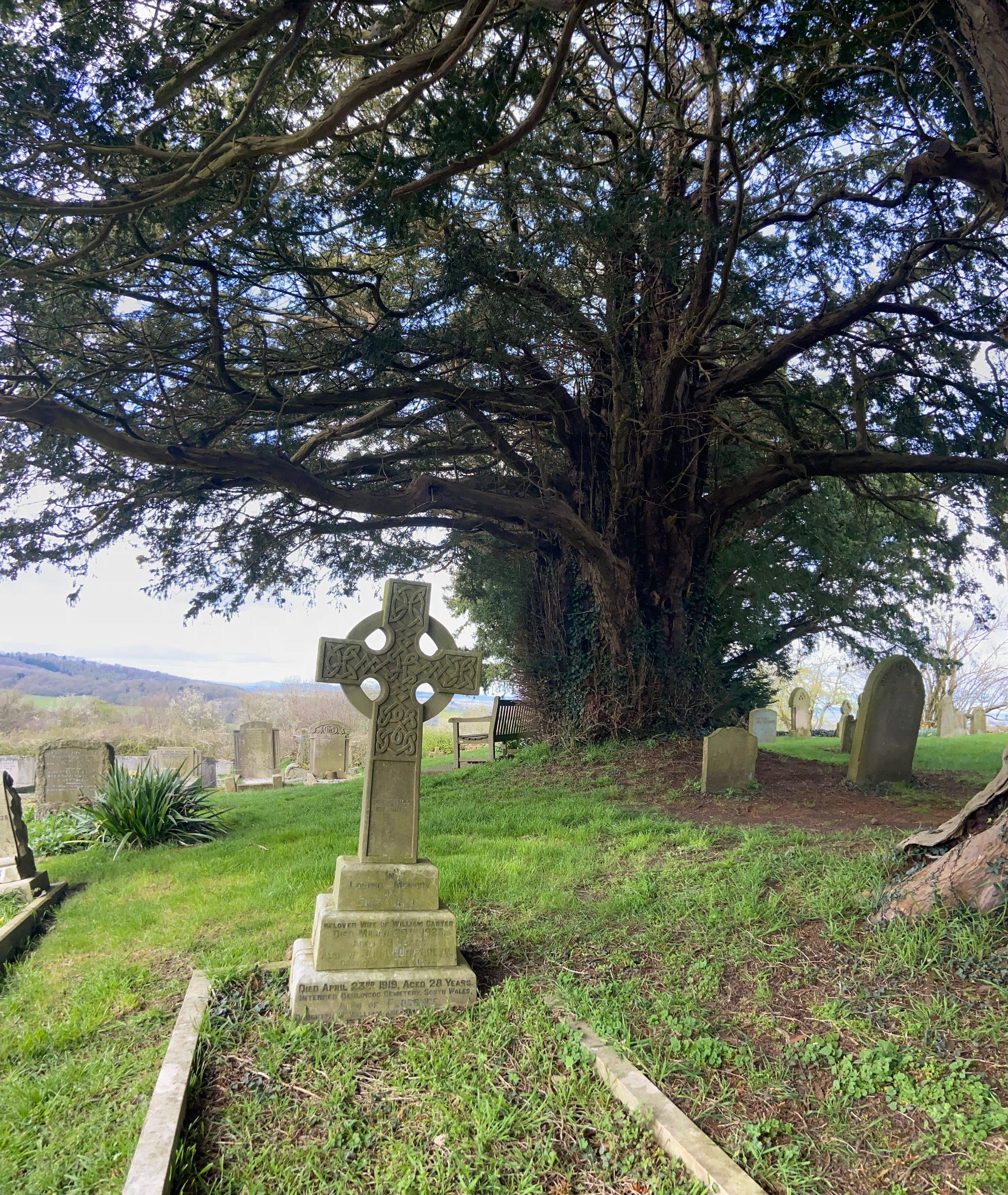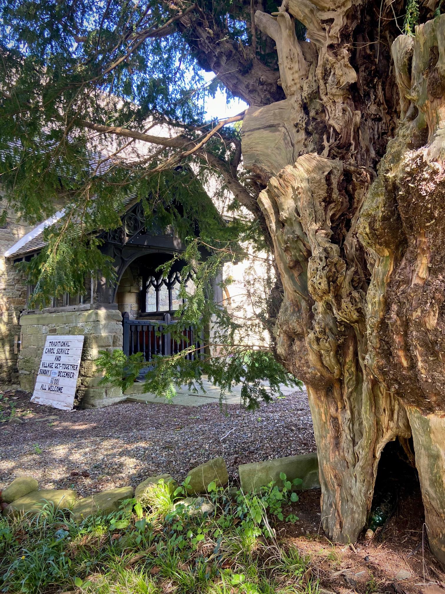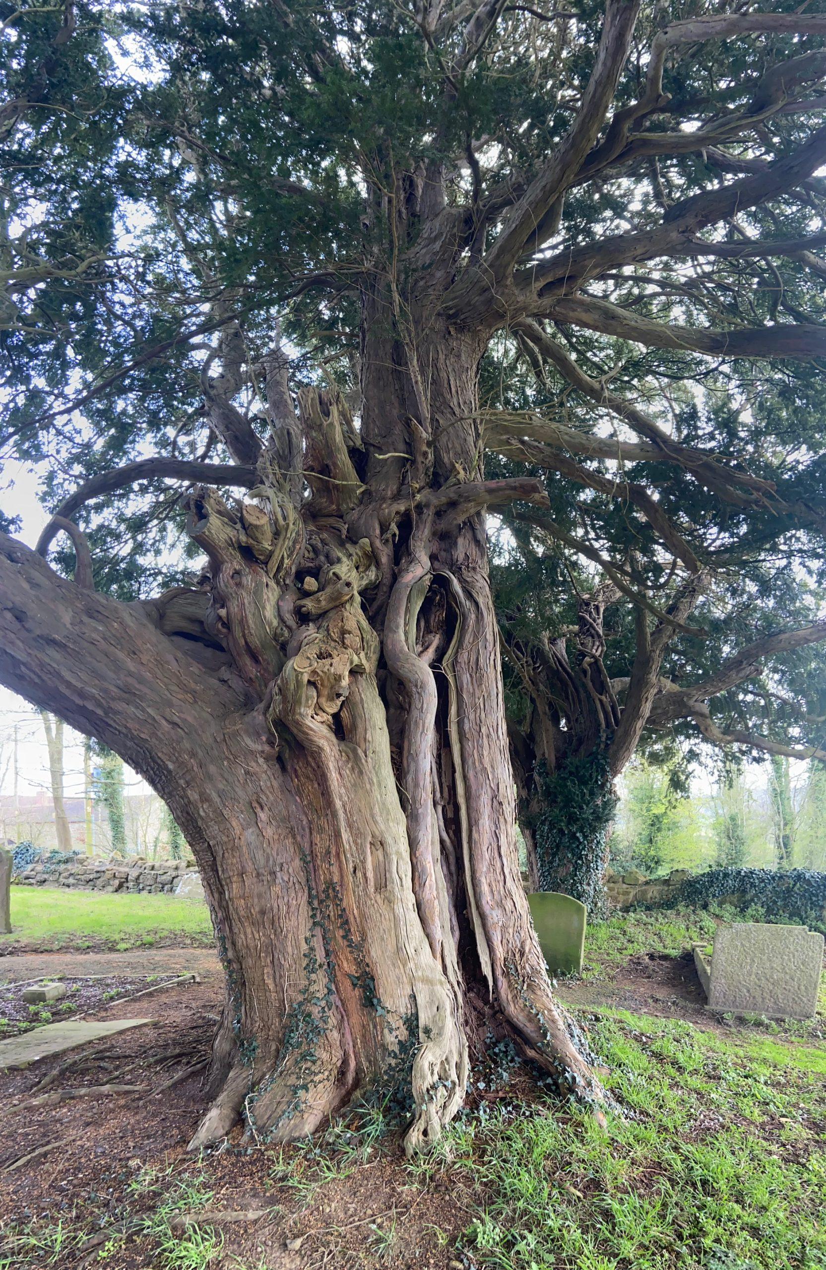 I’ve heard different stories about why Yew Trees are part of Church graveyards. King Edward I of England ordered yew trees to be planted in churchyards to protect the buildings, and possibly to deter grazing animals with the toxic tree. The Christian church commonly overtook pre-existing sacred sites and often yew trees pre-date their neighbouring chapels, churches, and cemeteries. It is believed that since ancient times, the yew has been a symbol of the transcendence of death. Their branches may grow long and replant themselves. Their internal bark can die whilst the outer regenerates. They are poisonous but also have healing properties. They are still, quiet and dark. They are hollow, allowing for sanctuary, and their branches fold you in like a tiny chapel.