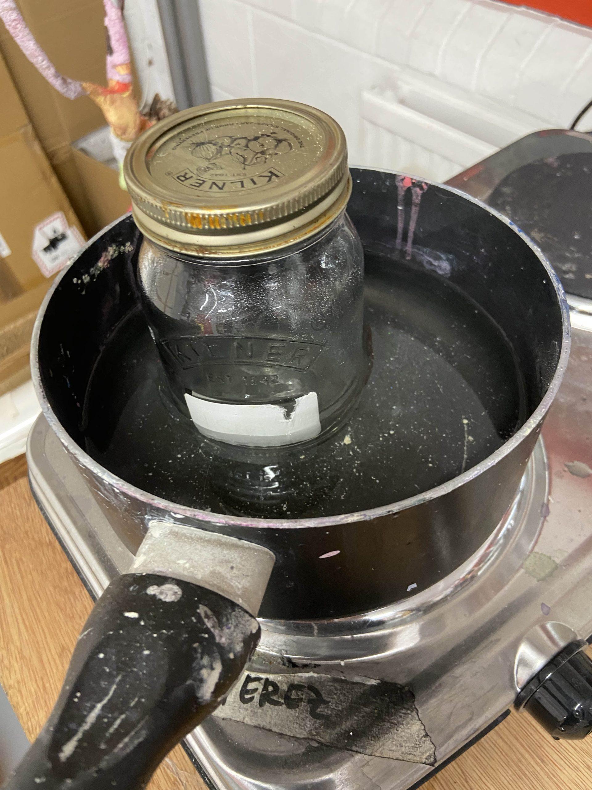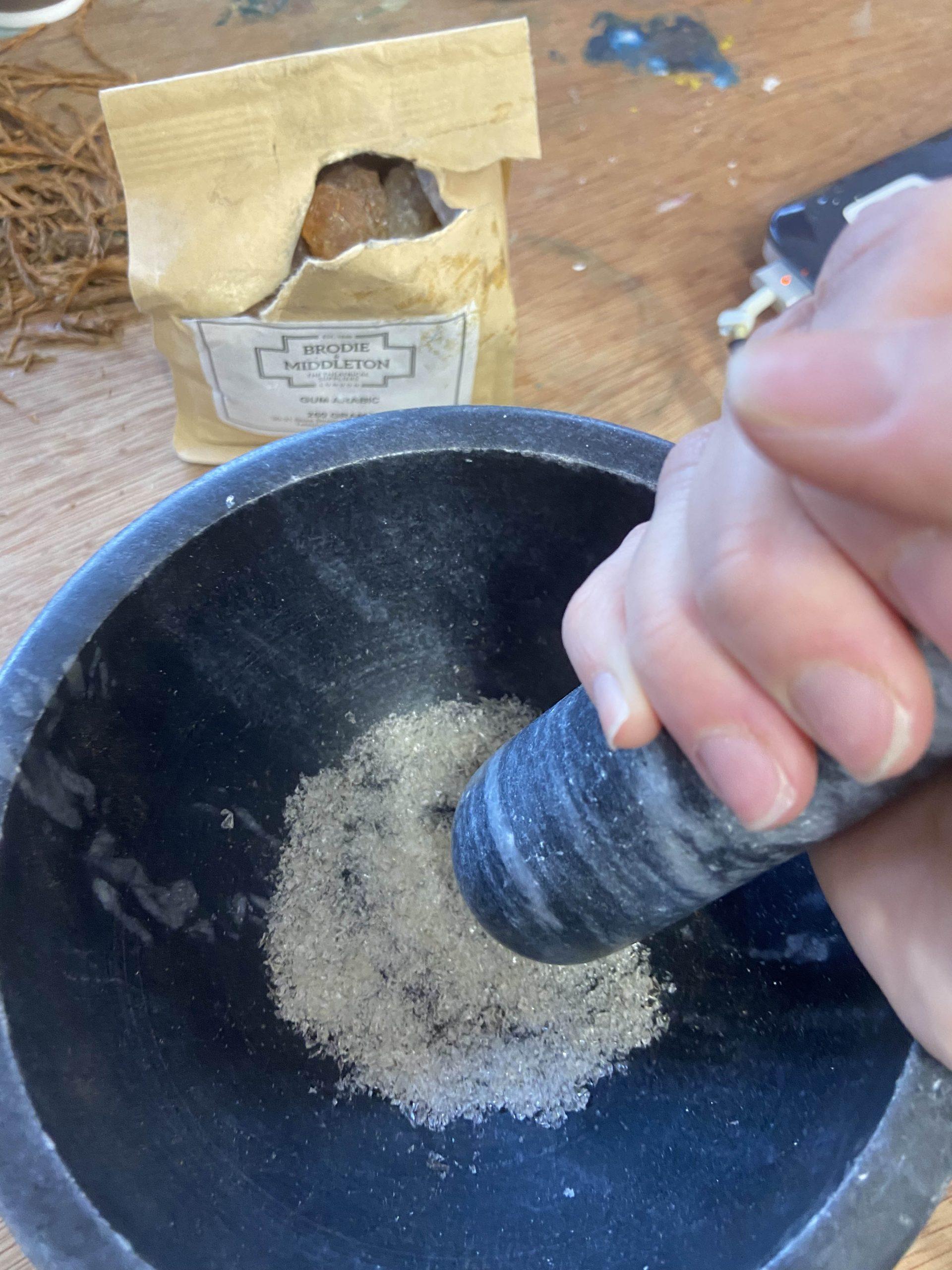 Without my recipe book (aka pigment bible), I perused some notes, blogs and youtube videos and tried to find my way. I ground up my gum arabic and dissolved over the hob, but I wasn’t sure about ratios because I only skimmed the blog posts… I mixed this with what I thought might be ‘1 part’ glycerine which is meant to keep the paint moist. Separately, I ground up my needles, then simmered on stovetop for about 20 minutes. However, in reflection, I should have simmered for an hour or possibly left over night to extract maximum pigment.
