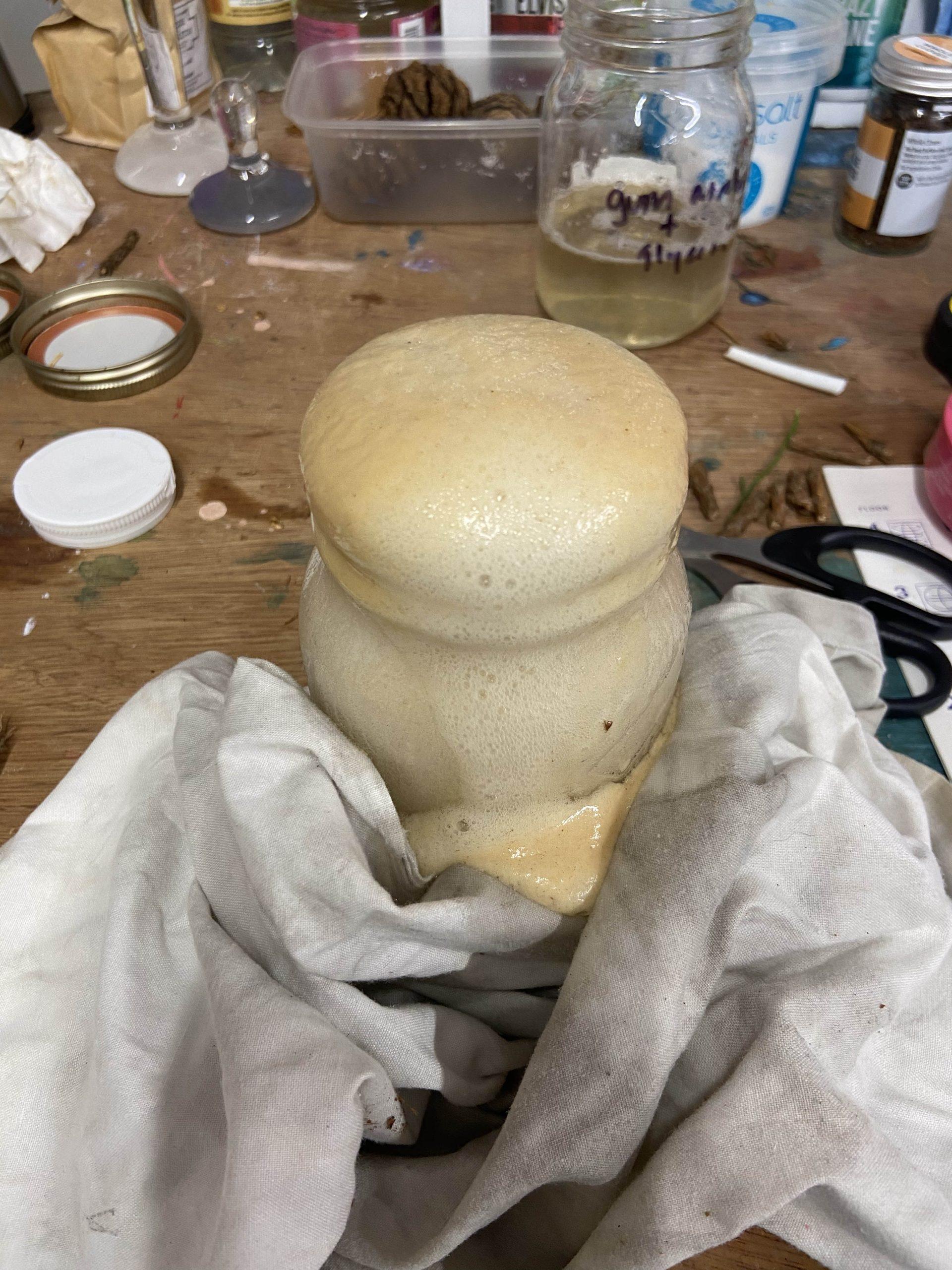I then filtered the needle water through coffee filters (but after a few rips, I see the value of cheesecloths..) then added what I guessed to be about 10 g alum and 5 g bicarbonate of soda- but I think I guessed very wrong- and ended up with a volcanic eruption.