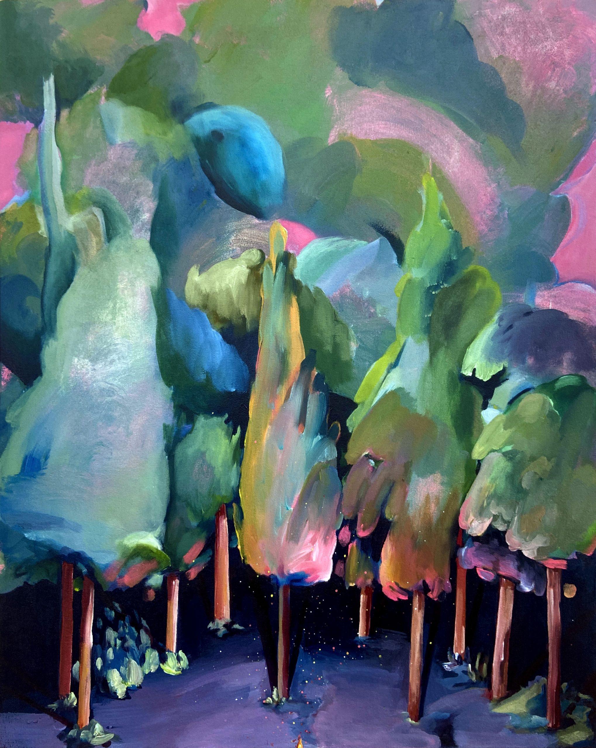 Ghost Story sits in an ambiguous space. Plumes of smoke merge into the forest canopy, blurring trees with sky. Sparks rise in the foreground- is it a cosy campfire or creeping wildfire? This painting is inspired by memories of home; as a child, sitting round the campfire with family, telling ghost stories in the redwood forests of Northern California. These memories merge with recent memories of going home only to find my familiar woods unrecognisable. There was not a place we visited that was untouched by burn, and our plans continually changed to escape the smoke. The sky was hazy most days, with the sun casting an eerie orange glow behind grey clouds.