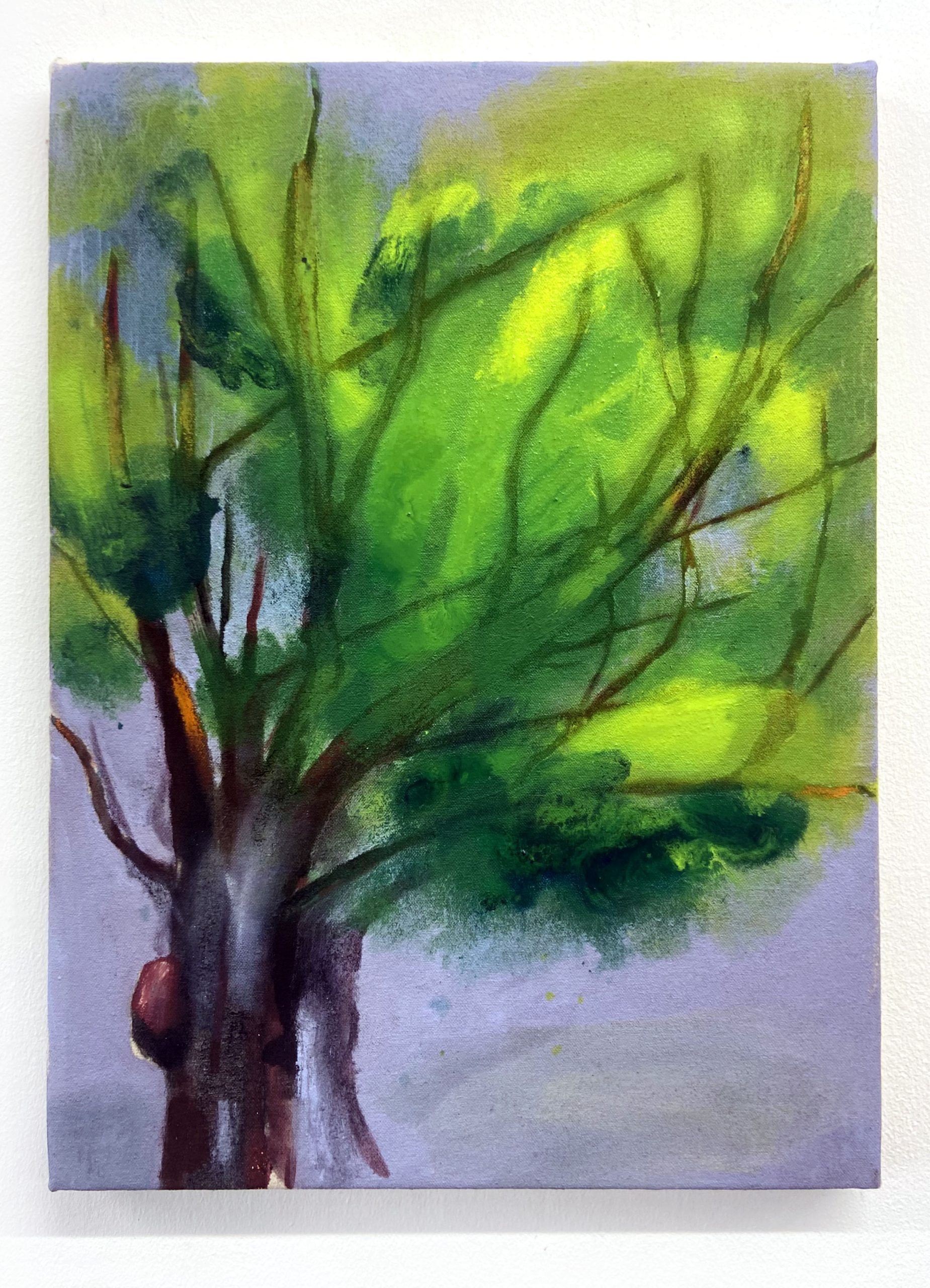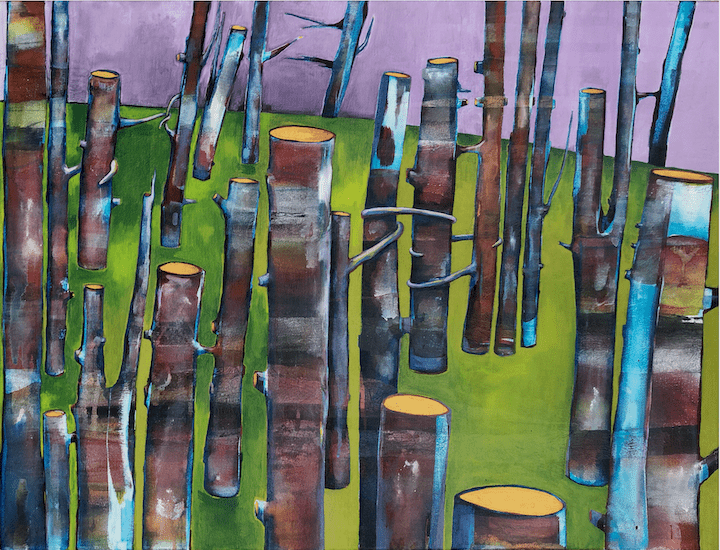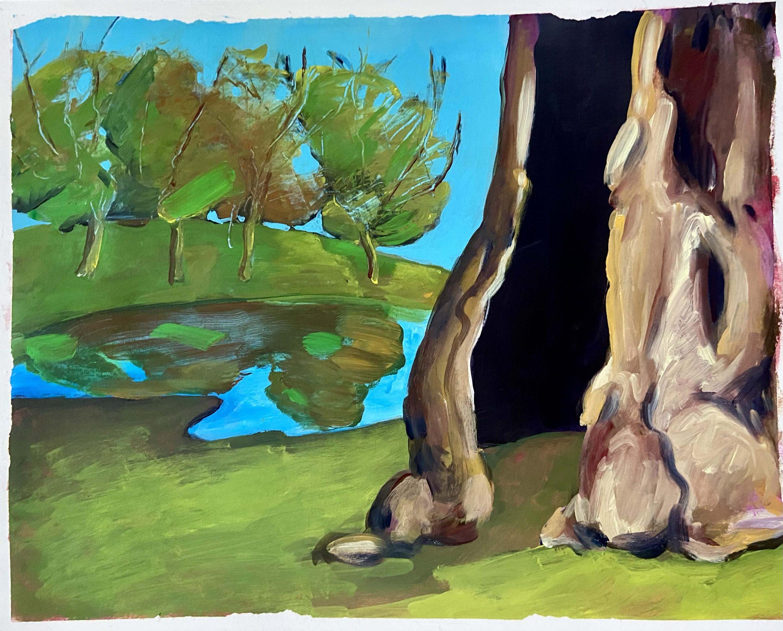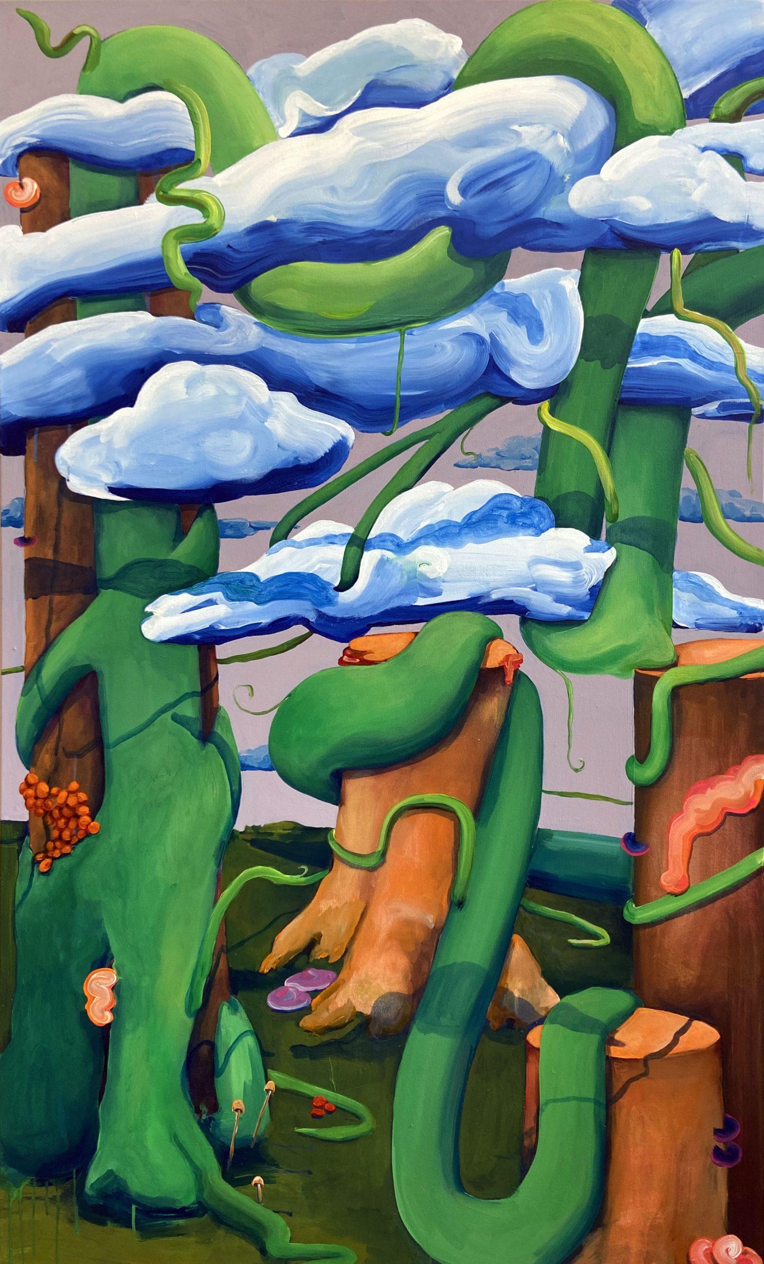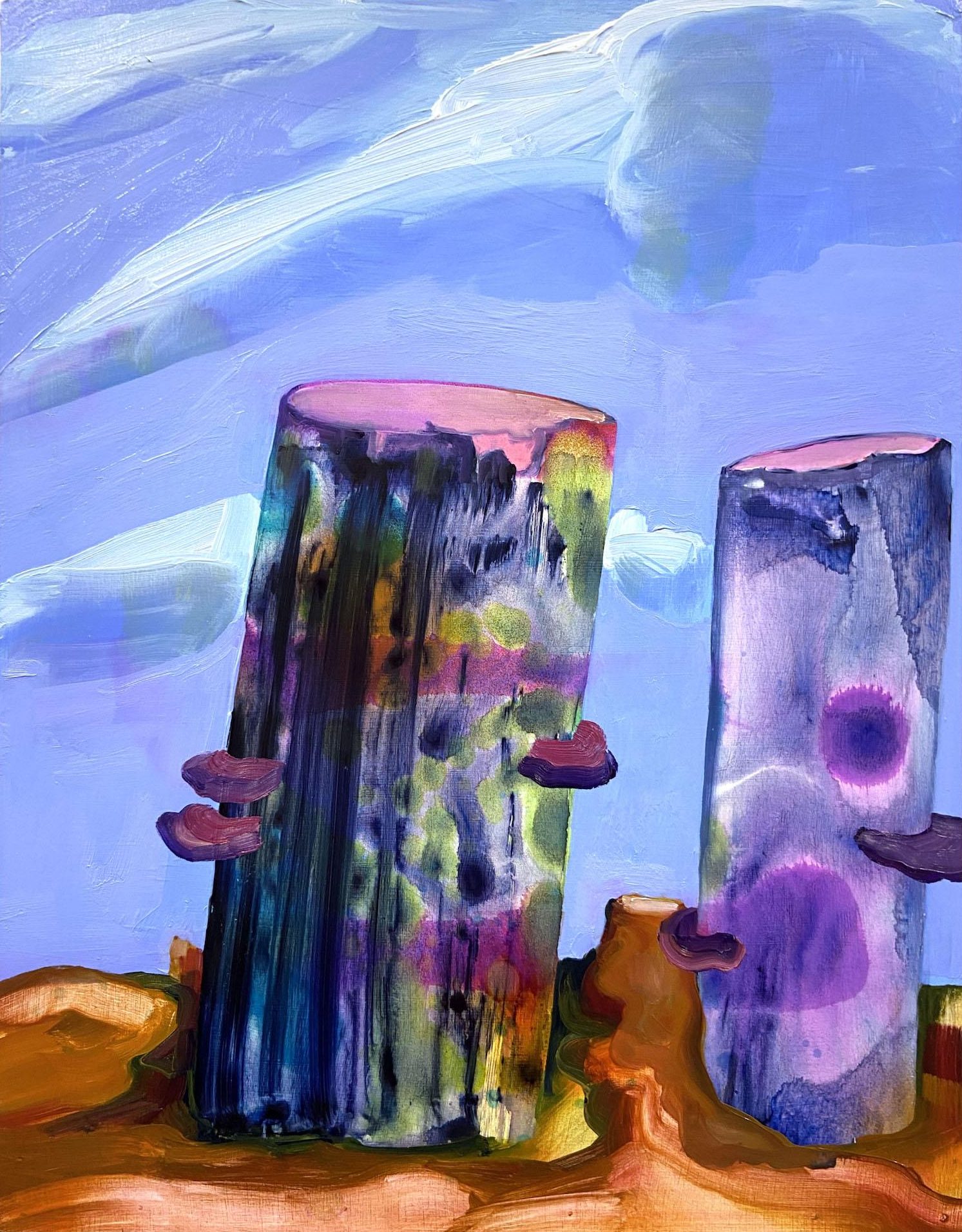 Skies and trees are ongoing themes in my work. Skies are about transience while trees tell a story of steady resilience. Tree stumps are headless figures; embodiments of disruption, but also places where life quietly thrives. Trees elicit memories of home, as well as an aspiration towards rootedness.