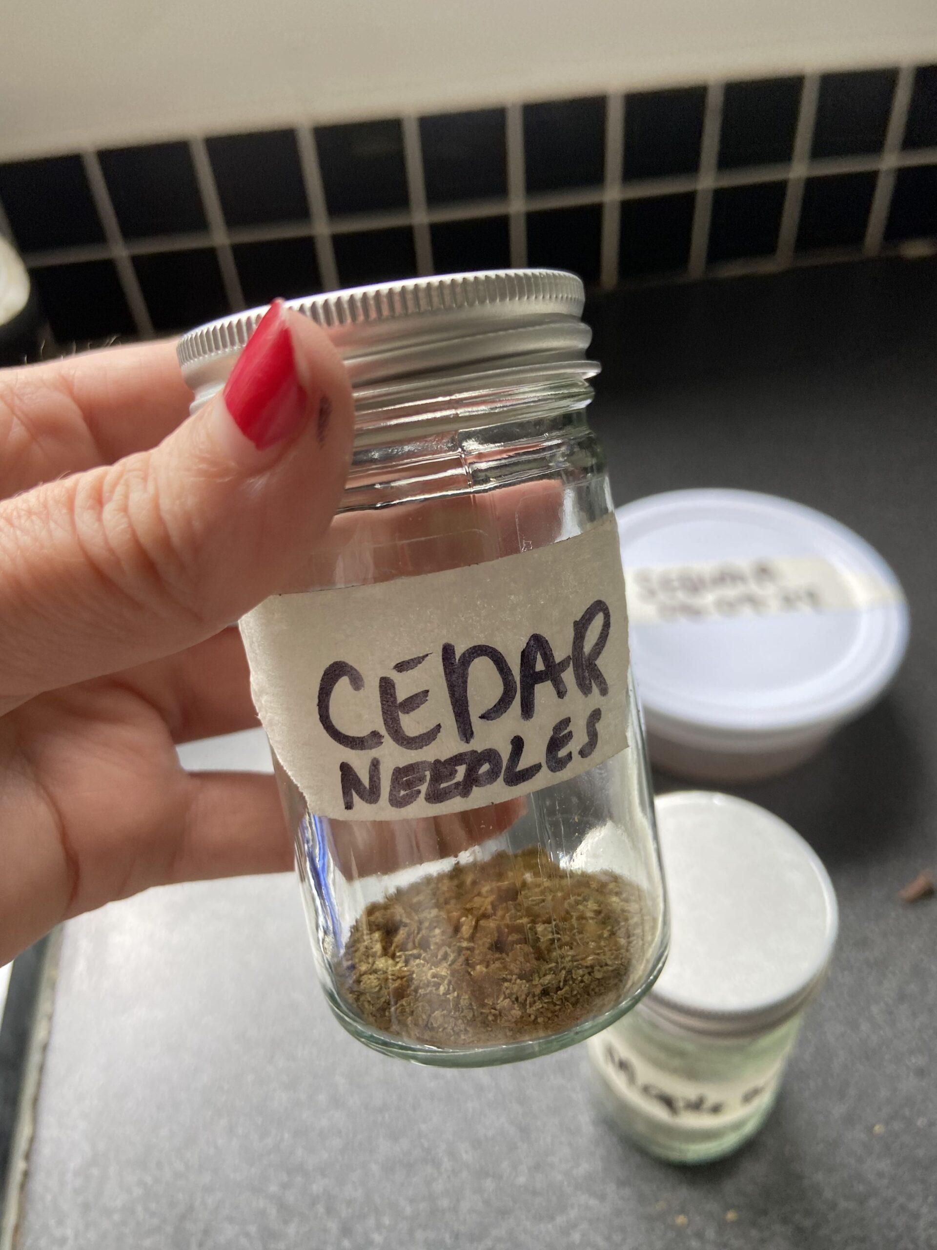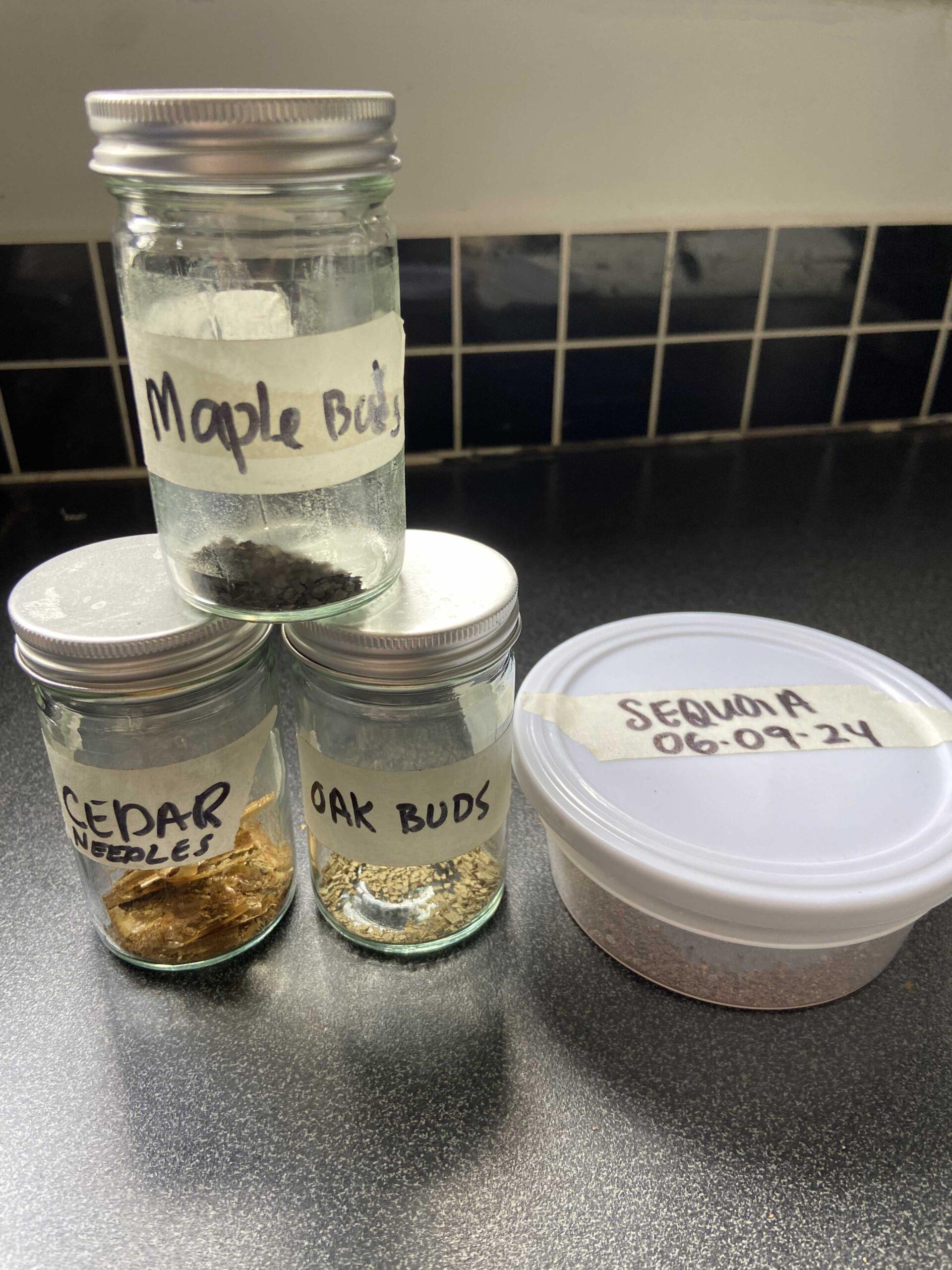 Back in March, I was given the task to look for and collect Norwegian Maple buds- for their incredible yellow-making ability, by my ink-making mentor Carolyn Morton, in preparation for an upcoming zoom-laking-lesson. (Laking is the process of making a dried pigment from ink). At the time, the budding Norwegian Maples were apparently abundant where she lives, but I did not see any in my area. However, I did find Field Maple and Sycamore Maple and collected some buds accordingly. I also collected Oak buds, Cedar needles and more Sequoia pine cones. Only small handfuls of each, but enough to have a play.